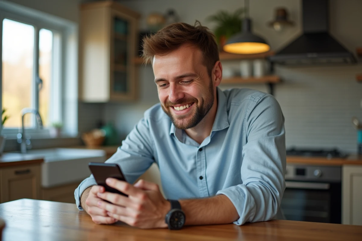 Homme souriant vérifiant son téléphone dans une cuisine moderne